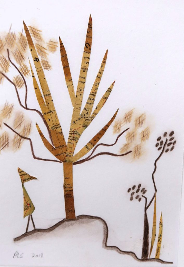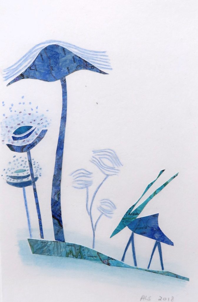 CHF 500.- Les 39 vues de la planète bleue, collages (cartes de géographie) et crayons de couleur; 32 x 23 cm, encadré